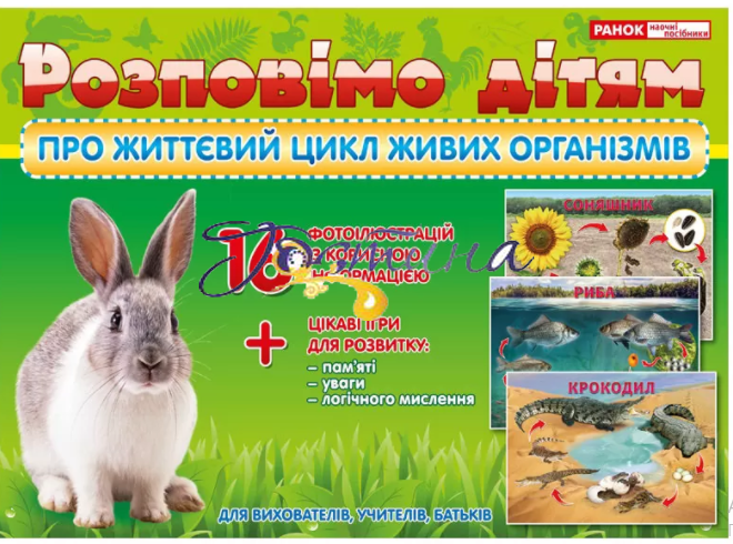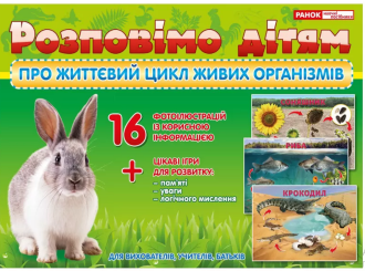 Розповімо дітям про життєвий цикл живих організмів. У наборі представлено 16 фотокарток, на яких зображена корисна інформація. Як з'являється соняшник, як риби виживають у воді. Так само в наборі є ігри для розвитку і закріплення пройденого матеріалу: 1) пам'яті, 2) уваги, 3) логічного мислення