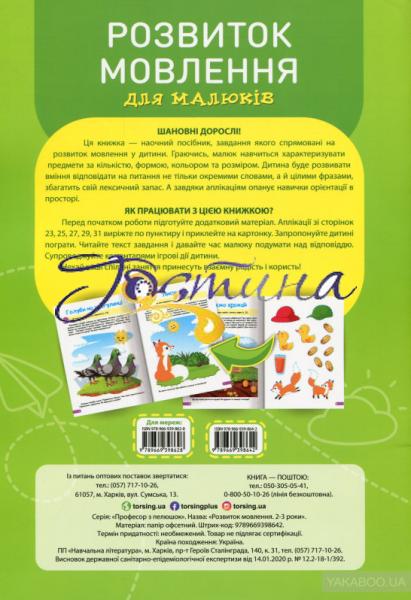Ця книжка — наочний посібник, завдання якого спрямовані на розвиток мовлення у дитини. Граючись, малюк навчиться характеризувати предмети за кількістю, формою, кольором та розміром. Дитина буде розвивати вміння відповідати на питання не тільки окремими словами, а й цілими фразами, збагатить свій лексичний запас. А завдяки аплікаціям опанує навички орієнтації в просторі.