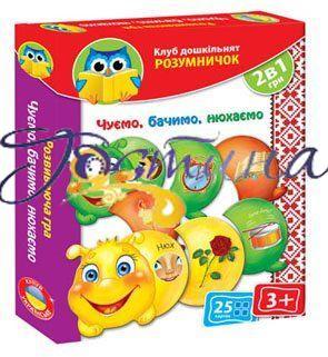 Розвиваюча гра "Чуємо, бачимо, нюхаємо" 2 в 1. Складається із 25 карточок. Мета гри: дитина повинна скласти всю гусінь, де малюнки на її елементах відповідають одному з органів почуттів. Крім того, картками можна грати в лото. Інструкція коробці.