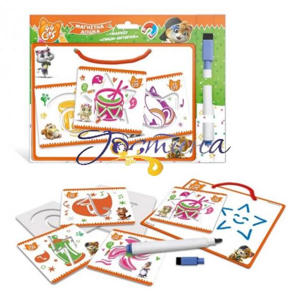 Грайте і вчіться разом з героями мультсеріалу «44 Кошеня»! Набір містить двосторонню дошку і трафарети! Малюк зможе малювати візерунки за допомогою маркера "Пиши-витирай". Старші за віком діти можуть тренуватися писати на дошці літери, слова та цифри. Маркер легко стирається з поверхні дошки, тому писати можна безліч разів! Вчіться граючи і проводите час з користю! А також тренуйте в процесі гри дрібну моторику, логічне мислення, уважність і фантазію.