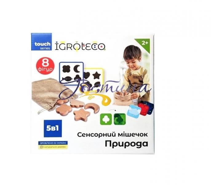 Сенсорний мішечок "Природа" від Igroteco є навчальною іграшкою для дітей, яка сприяє розвитку сенсорної сприйнятливості та моторики. Дитина, перебираючи різні дерев'яні фігурки, розвиває тактильну чутливість і дрібну моторику, а отже і мовлення. 6 варіантів ігор: 1. Вибери фігурку в мішечку, не виймаючи назви її. 2. Дорослий називає фігурку, а малюк має знайти її серед інших. 3. Гра у класичне лото. 4. Балансир 5. Знайди пару кольоровій карточці, на якій позначено контуром конкретну фігурку.Складай карточки з малюнком фігур в різній послідовності, а потім по черзі виймай їх. 6. Складай карточки з малюнком фігур в різній послідовності, а потім по черзі виймай їх.