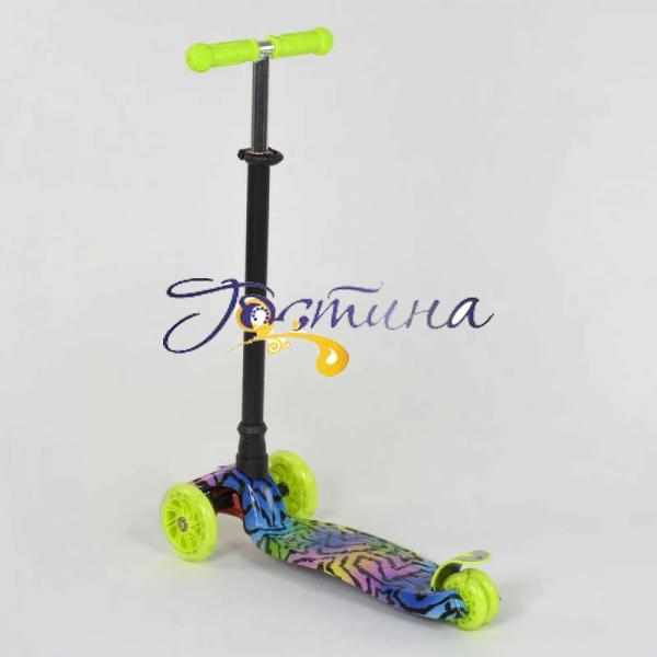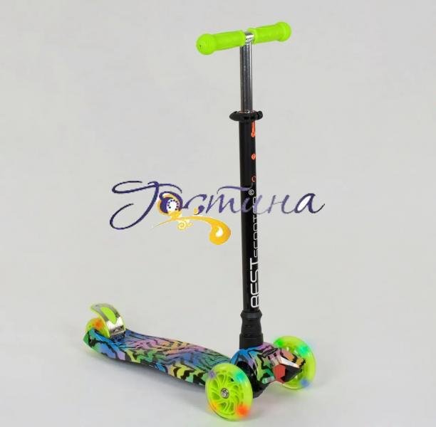 Триколісний самокат з колесами що світяться від "Best Scooter" призначений для маленьких любителів активного відпочинку. Яскравий дизайн даної моделі з першого погляду приверне увагу малюка і стане улюбленим транспортним засобом! За рахунок триколісній конструкції і здвоєного заднього колеса самокат досить стійкий і запобігає падінню під час катання. Пластмасова дека самоката виконана з міцного матеріалу і кріпиться на раму. Т-подібне кермо має міцну металеву основу. Висота керма фіксується в 3х положеннях. Фігурні гріпси виконані з гуми з рельєфними візерунками, які запобігають зісковзування долоні з керма під час катання. Похила система повороту керма забезпечує максимально легке і безпечне управління самокатом. Особливості моделі: - яскравий і стильний дизайн; - світяться колеса; - регулювання висоти керма; - похила система повороту керма; - гумові гріпси; - ножні гальма на задньому колесі; Характеристики: - поліуретанові колеса; - ширина керма - 26 см; - висота керма регулюється від 77 см до 86 см, з фіксацією в 3х положеннях; - розмір деки - 55 х 13 см; - розміри коліс: передні колеса: діаметр -12см, ширина - 2.4 см; задні колеса: діаметр - 8 см, діаметр - 2.4 см; матеріали: Кермо - алюміній; Дека - пластик; Колеса - поліуретан (PU).