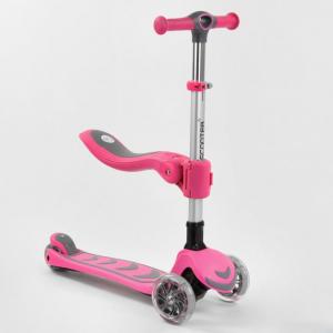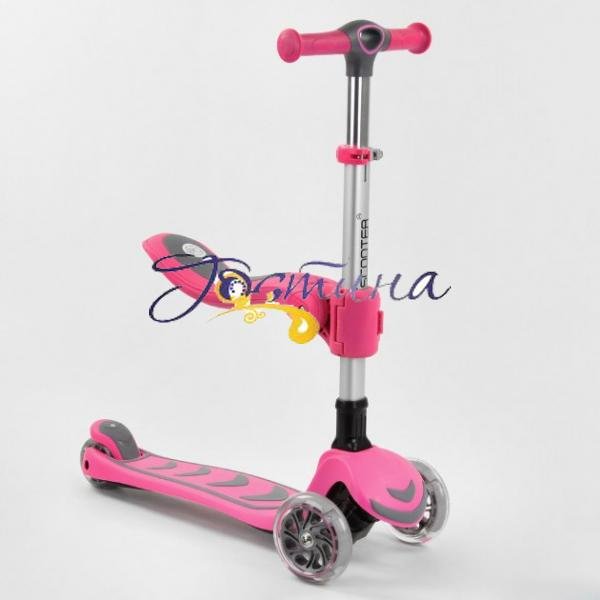 Триколісний самокат Best Scooter з сидінням, алюмінієвим кермом, і з колесами, що світяться - все, що необхідно для активного відпочинку дитини! Система керма оснащена новим механізмом повороту, що забезпечує максимально легке керування самокатом. На стійці знаходиться кнопка для складання керма: затискаєте кнопку, підтягуєте кермо вгору до клацання і складаєте. Висота керма має три рівні регулювання та затиск для надійної фіксації. Ручки виконані з якісної, приємної на дотик гуми. Конструкція самокату складається з трьох коліс – два передніх та заднє здвоєне колесо. За рахунок матеріалу з якого виготовлені колеса даної моделі – поліуретан – самокат безшумний, а їзда на ньому м'яка та комфортна. Усі колеса під час руху світяться різнокольоровими кольорами. На деці розташовуються прогумовані елементи, завдяки чому самокат стійкий для стопи та безпечний для дитини. Оснащений ножним гальмом, що наступає (step-on brake), який розміщений над заднім колесом. Характеристики: • Розміри самокату: Ширина – 24 см, довжина – 58 см; Ширина деки – 13 см, довжина – 30 см; Кермо має три положення за висотою (від підлоги): 69, 74 та 79 см. Ширина керма – 27 см, діаметр ручок: 3 см; Висота сидіння від підлоги – від 30 см до 50 см • Розміри коліс: Передні колеса: діаметр – 12 см, ширина – 3 см; Задні колеса: діаметр – 8 см, ширина – 4,5 см. • Матеріали: Кермо – алюміній; Затискач керма – алюмінієвий + пластиковий фіксатор; Дека – пластик; Колеса – поліуретан (PU). Максимально допустиме навантаження – 60 кг.