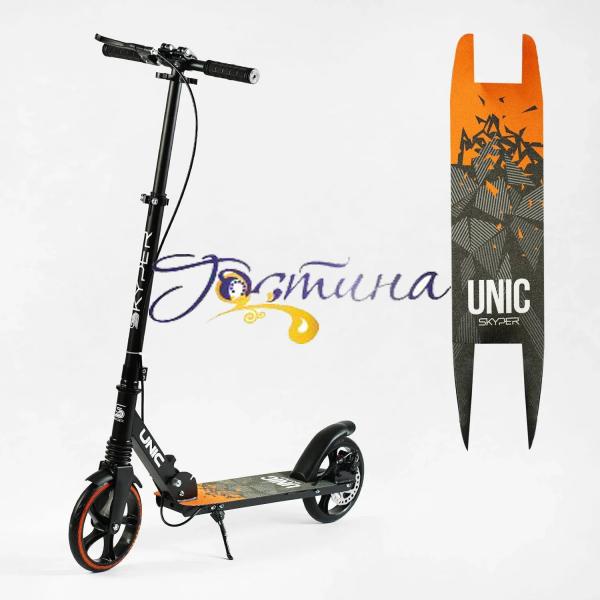 Рама самоката виготовлена із міцної сталі, яка стійка до навантажень. Висоту керма можна відрегулювати під зростання дитини. Поліуретанові колеса виготовлені із високоякісних матеріалів, підшипники стійкі до зношування. Є два види гальмування: дискові ручні на кермі і ножні на задньому колесі. Механізм складання дозволяє максимально компактно скласти самокат для перенесення та транспортування. особливості: передній амортизатор; крила над колесами; проста система складання; гумові