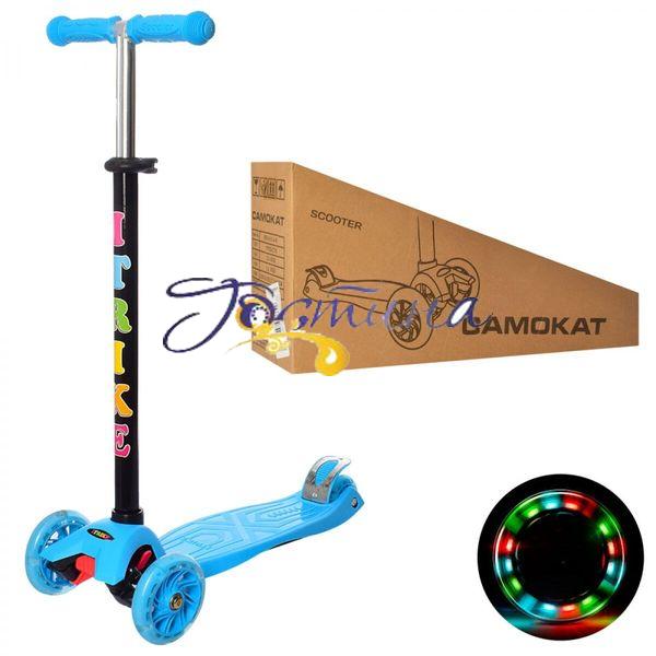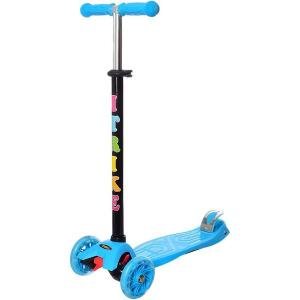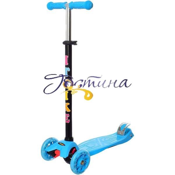 Самокат приведе в захват будь-якої дитини. Він зручний, барвистий, а його колеса оснащені яскравим підсвічуванням, що робить особливо ефектним катання на ньому в темний час доби. Триколісна конструкція робить його максимально стійким, і вбереже від падіння дитини, який ще не навчився тримати рівновагу. Кермо регулюється по висоті залежно від росту дитини. Він також оснащений зручними накладками, які не дозволять рук зісковзнути.