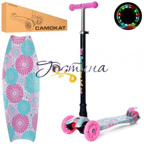 Тип самокату: самокат-скутер Кількість коліс: 3 шт ПВХ-світло 2 передні колеса: 120 мм заднє колесо 70 мм підніжка 32-13 см матеріал сталь + алюміній