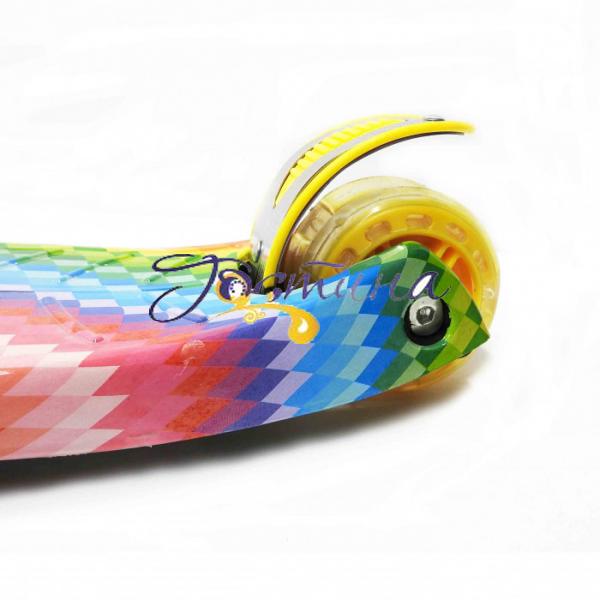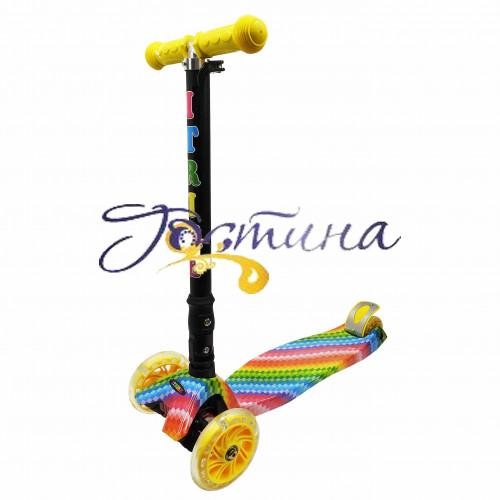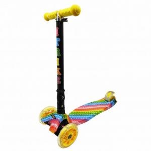 Стійкий самокат надійно сконструйований з надміцної рамою і зручною ручкою керма. Самокат триколісний, має красиву підніжку з яскравим і незвичайним дизайном, ззаду встановлений надійні ножні гальма. Колеса великі і безшумні, при їзді діоди всередині коліс світяться. Самокат стане безпечним транспортом для вашого малюка, він відмінно підійде для довгих прогулянок у парку або у дворі, самокат - це улюбленний транспортний засіб хлопчиків і дівчаток! Подібний вид транспорту сприятливо впливає на м'язовий корсет дитини, дозволяє розвивати рівновагу, координацію руху, дуже корисний для опорно-рухового апарату. Ручка самоката регулюється під зріст малюка, а розбірна конструкція самоката, робить його компактним і зручним для зберігання.