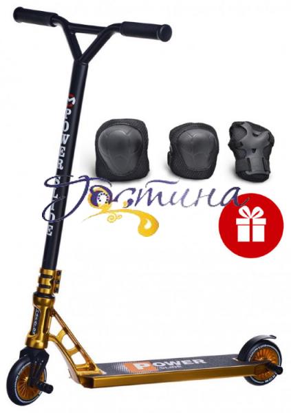 Трюковий самокат для екстремального катання, стрибків, виконання різних трюків. Надійний 3-х болтовий хомут. Посилена дека із міцного алюмінію. Колеса 110 мм PU з дисками з дюралюмінію
