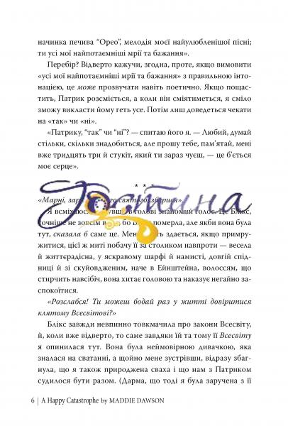 І ось восьмирічний сюрприз із минулого Патрика з’являється на порозі, вдирається в їхні життя — і це перевертає все. Хоча це не зовсім ті зміни, які вона передбачала, Марні вмить сприймає їх як появу сім’ї. Але Патрик, боячись нового болю, тікає в себе. Раптом дві дуже різні частини прекрасного цілого стає дедалі важче сумістити. Як Марні може довіряти магії Всесвіту, коли він, здається, робить усе можливе, щоб збити її з ніг?
