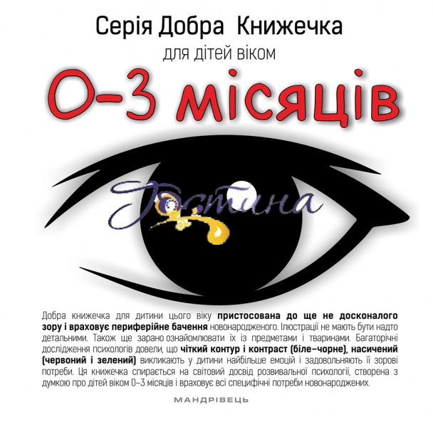Добра книжечка для дитини цього віку пристосована до ще не досконалого зору і враховує периферійне бачення новонародженого. Ілюстрації не мають бути надто детальними. Також ще зарано ознайомлювати їх із предметами і тваринами. Багаторічні дослідження психологів довели, що чіткий контур і контраст (біле-чорне), насичений (червоний і зелений) викликають у дитини найбільше емоцій і задовольняють її зорові потреби. Ця книжечка спирається на світовий досвід розвивальної психології, створена з думкою про дітей віком 0-3 місяців і враховує всі специфічні потреби новонароджених.