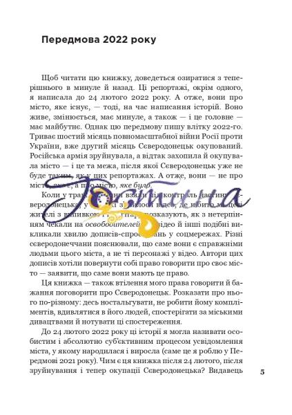 Ці репортажі, за одним винятком, написані у 2020–2021 роках. Вони розповідають про Сєверодонецьк до повномасштабного вторгнення Росії. Читач дізнається про те, яким було і чим жило до 2022 року це місто Луганщини, місто на межі Донбасу і Слобожанщини; як воно переходило від ідентичності радянського промислового міста до усвідомлення себе містом у незалежній Україні. Одні репортажі розповідають про людей цього міста, інші – про локації, треті – про важливі для Сєверодонецька події, зокрема 2004-го і 2014 року. Авторка народилася і виросла в Сєверодонецьку, тому в цій книжці балансує між репортажним письмом і суб’єктивним, часом іронічним, поглядом на місто.