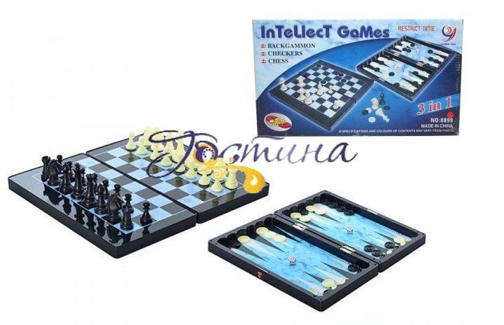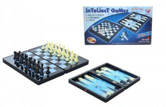 Набір інтелектуальних ігор магнітних середніх розмірів. У комплект входять фігури для шахів, шашок та набір для гри в нарди. З зовнішнього боку дошка має стандартну розмітку для шахів та шашок, а всередині – для нард. Розміри дошки 31,5 x 35 см. Комплектація: шашки, шахи, нарди, 2 кістки з крапками та одна з цифрами, дошка. Матеріал: пластик. Розмір складеної дошки 31,5 x 17 x 4 см.