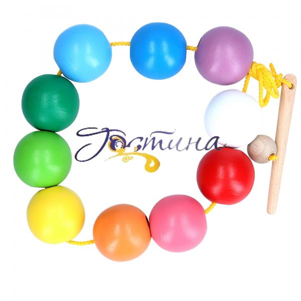 Шнуровка “Кольорові кульки” чудова іграшка призначена для розвитку дитини. Іграшка покращує сенсомоторну координацію рухів, вдосконалює координацію системи “око-рука”, глазомір, посидючість, концентрацію уваги. Шнуровка готує руку дитини до письма та допомагає швидшому розвитку мови. Кольорова шнуровка допоможе вивчити кольори. Іграшка зовсім не складна. Ми пропонуємо нанизувати деталі в довільній черговості. Ідеальна для початківців. Для зручності комплектується голкою для нанизування та фіксуюючим елементом. Матеріал – натуральне дерево, що пофарбоване якісними європейськими фарбами на водній основі. Діаметр кожного елемента: 4 см, голочка – 10 см. В наборі 10 кульок. Іграшка зроблена в Україні з любов’ю до дітей! Дуже проста та надійна конструкція іграшки буде довгі роки веселити дитину!