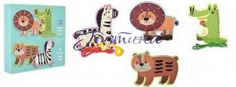 Шнурівка «Тварини», MD 2110 від виробника розвиваючих іграшок Shantou послужить чудовим тренажером для розвитку дрібної моторики та координації рухів маленької дитини. Захоплююче заняття буде корисне малюкам з раннього віку, забезпечить цікаве дозвілля в будь-якому місці. У комплекті – 4 фігурки диких тварин із барвистим оформленням. Використовуючи уяву і спритність пальців малюка обов'язково впорається з візерунковою вишивкою, доповнивши кожен планшет новими деталями у вигляді смуг. У результаті у малюка вийде тигр, крокодил, лев і зебра з характерним смугастим забарвленням. Особливість шнурівки – використання виготовлення натурального, екологічно чистого матеріалу – якісної деревини. Поверхня фігурок добре відшліфована, покрита нетоксичними фарбниками, повністю безпечними для здоров'я. Іграшка допоможе потренувати уважність, акуратність, образне та логічне мислення. ; Вік: від 3 років; Матеріал: дерево; Розміри: 19,5 x 19,5 x 4 см; Комплектація: шнурки – 4 шт., фігурки – 4 шт.; Виробник: Shantou; Зроблено у: Китай
