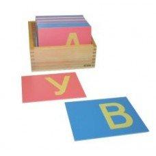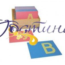 Розвиваючий матеріал Монтессорі для вивчення букв.   У комплекті: наклеєні на дощечки літери українського алфавіту, вирізані з шорсткою папери. Голосні букви на рожевому тлі, приголосні - на блакитному. Мета занять: познайомити дитину з буквами, зв'язати їх форму зі звучанням. Перед тим, як почати вивчати букви потрібно частіше звертати увагу дитини на звуки, які зустрічаються в мові, навчити його ідентифікувати окремі звуки. Роботу з буквами можна починати тоді, коли дитина вміє чути і виділяти в слові окремі звуки. Приклади завдань: Викладач вибирає три сильно відрізняються за формою і звучанням літери. Імітуючи процес написання, середнім і вказівним пальцем проводить уздовж літери (рука рухається одночасно з пальцями), вимовляє то як вона звучить, потім називає слово яке починається з цієї літери. Учитель пропонує дитині зробити те ж саме, згадати інші слова, які починаються з цієї літери.При повторенні завдання важливо кожен раз обводити букви і повторювати звуки. Дитині пропонується обвести пальцем букву, вимовити її і відкласти;Роздати букви тим дітям, в іменах яких вони зустрічаються;Покласти букви на ті предмети, з яких вони починаються;Покласти букву з іншого рухомого алфавіту на шорстку букву з таким же звучанням (в цій вправі дитина порівнює розміри і форми букв).Дитина обводить літеру з закритими очима і називає її;Дитина називає і показує іншим дітям букву. Діти підбирають слова в яких зустрічається ця буква;Дитина називає і показує букву. Інші діти називають слова з цією буквою з однієї сфери (наприклад імена, назви кольорів, предмети меблів).При вивченні шорсткуватих букв дитина готує руку до листа, запам'ятовує правильне написання букв, розвиває мову.