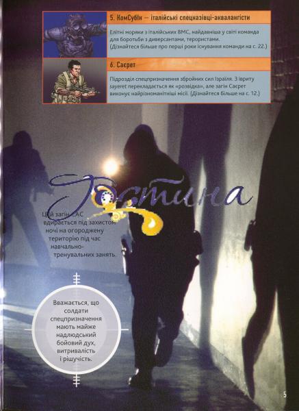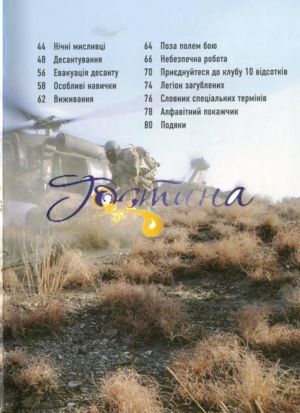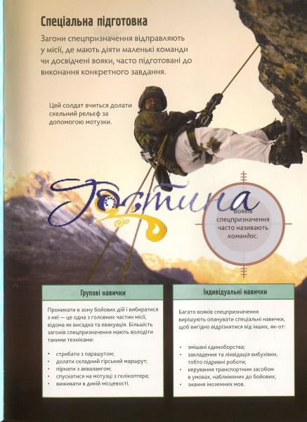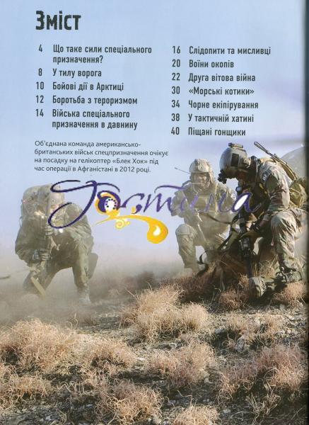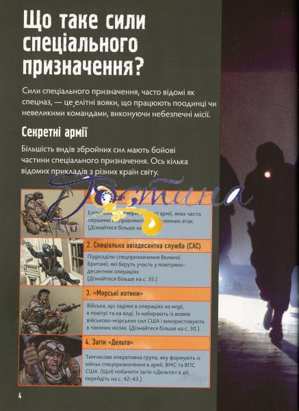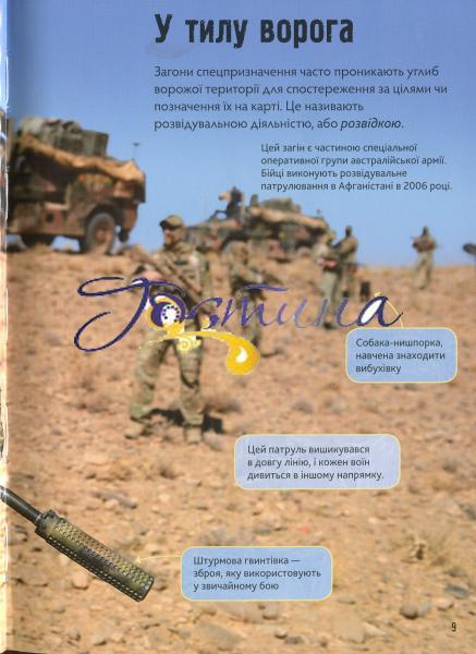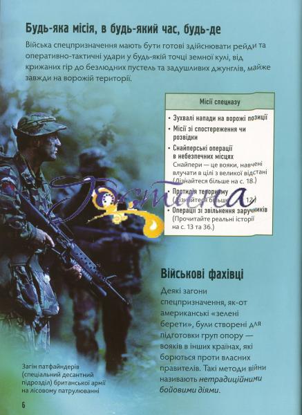 Ця книжка познайомить вас з кращими із кращих, елітними вояками, що пройшли найскладніший вишкіл на землі та готові безстрашно виконати місію в будь-яких умовах проти будь-якого ворога. Ви дізнаєтеся, ким були перші командос, як звичайні солдати стають військовим спецназом, як бійці спілкуються без слів, у чому відмінність між висотними парашутами, що розкриваються на малій і на великій висоті. Цікава розповідь про підрозділи сил спеціального призначення доповнена світлинами й рисунками. Для молодшого шкільного віку.