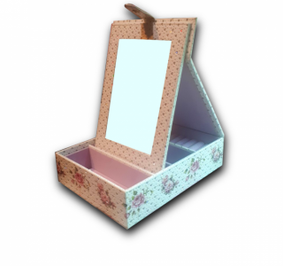 Біла матова еко шкіра зі стильним малюнком інкрустована камінням у вигляді сердець. Усередині скринька оброблена велюром. Також усередині розташоване Велике Дзеркало