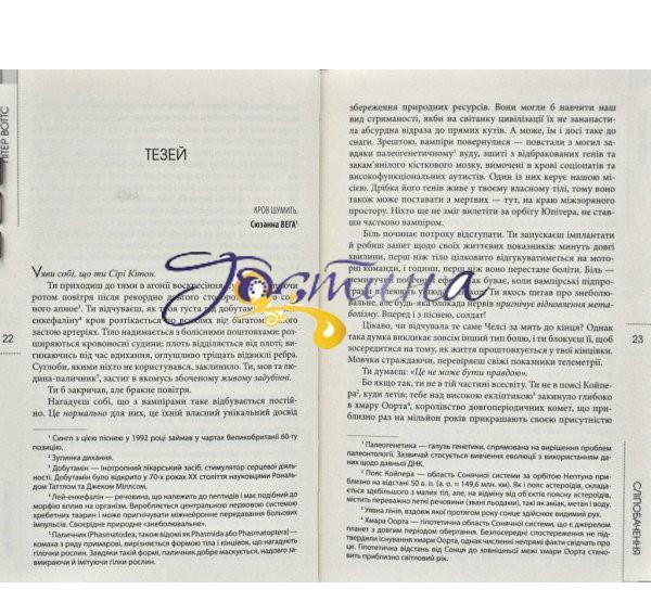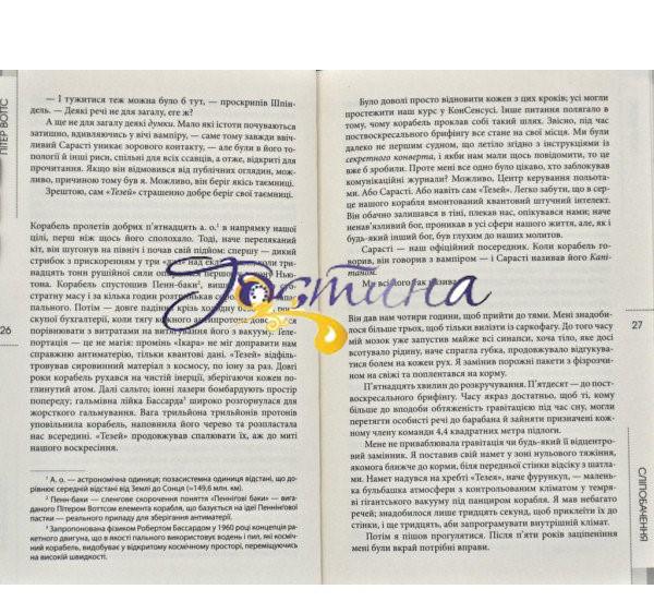 Перед вами – беззаперечно наукова фантастика у найточнішому сенсі цього слова! Твір включає в себе багато точних наукових фактів та перемішується з фантастичними подіями, але сам по собі не є «сухим», а навпаки настільки затягує, що відірватись від нього важко. Не даремно цей роман Воттса називають найкращим та найважливішим у його доробку.