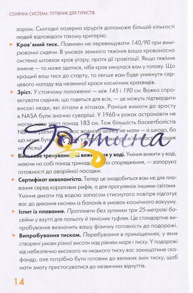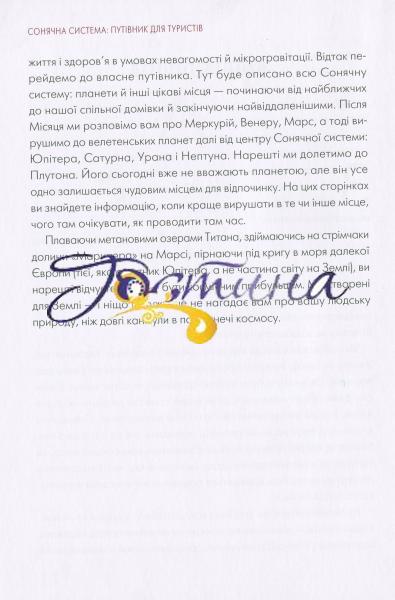 Поважний науковий багаж і рушійна сила уяви - два складники чудово проілюстрованого путівника нашою Сонячною системою. "Сонячна система: путівник для туристів" - незамінна книжка у валізі кожного космічного мандрівника. У ній ви знайдете всю важливу інформацію про майбутню подорож, зокрема про те, як дістатися до того чи іншого місця Сонячної системи й що робити після прибуття. Не знайти кращої книжки для шукачів космічних пригод і тих, кого в космічних подорожах захоплює наука. Не шукайте інших путівників, не чекайте іншої нагоди - ваша ракета вже готова до старту!