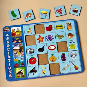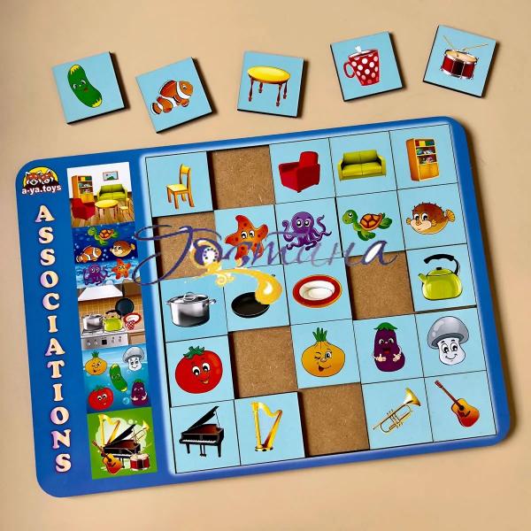 Дерев'яна гра "Асоціація". Складається з планшета та дерев'яних фішок. Потрібно вибудовувати асоціативний ряд. Добре тренує дрібну моторику, логіку, пам'ять, увагу, мислення. Розмір рамки – 32,5 х23 см.