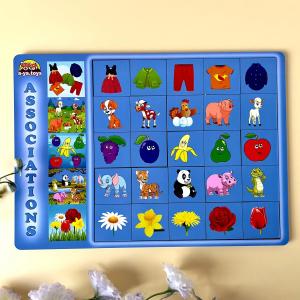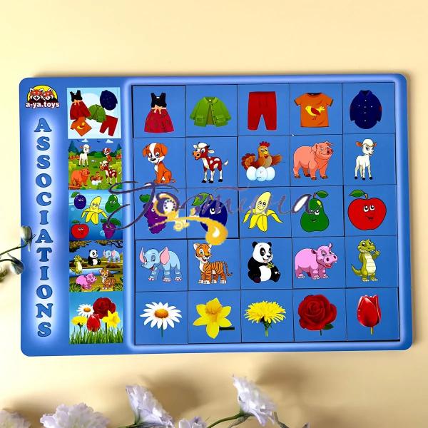 Сортер складається з планшета, на якому зображено 5 картинок та 25 плашок із різними персонажами, які дитині потрібно підібрати під тематичні картинки. Гра добре тренує асоціативне мислення у дітей. Плашки зручно рахувати та грати в гру "5-й зайвий".