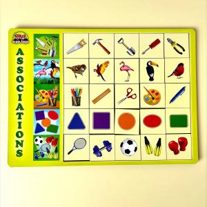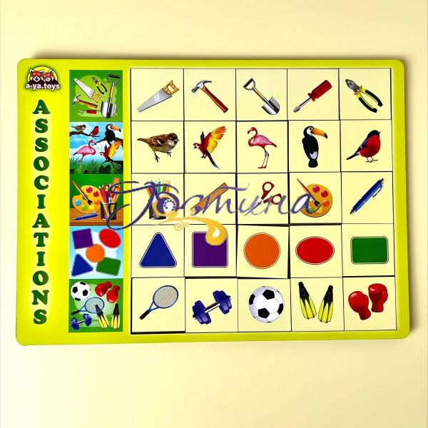 Сортер складається з планшета, на якому зображено 5 тематичних картинок та 25 плашок з різними персонажами та предметами, які дитині потрібно підібрати під тематичні картинки. Гра добре тренує асоціативне мислення у дітей. Плашки можна вважати і грати ними в "5-й зайвий"