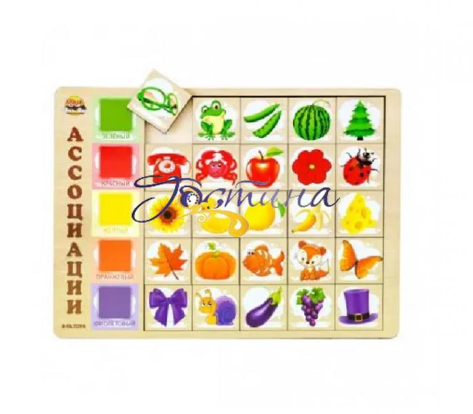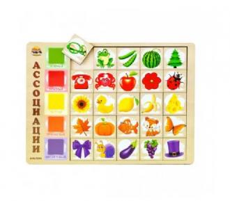 Дерев'яна гра "Асоціація". Складається з планшета та дерев'яних фішок. Потрібно вибудовувати асоціативний ряд. Добре тренує дрібну моторику, логіку, пам'ять, увагу, мислення.