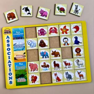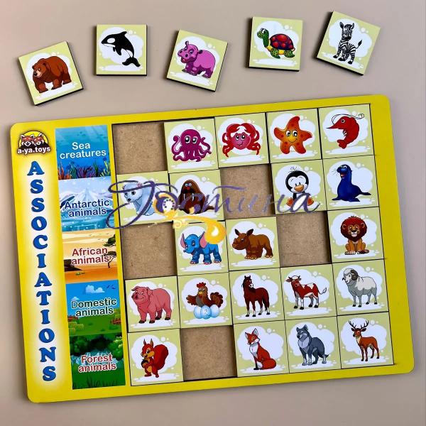 Дерев'яний планшет-рамка, на якому зображені п'ять різних картинок середовища існування тварин. Квадрати в ряд (всього 5 рядів - 25 квадратних плашок) з тваринами. Необхідно правильно впорядкувати тварин за їх природним середовищем існування.