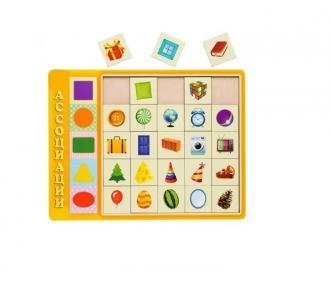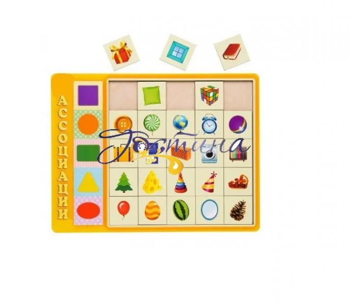 У наборі: дерев'яний планшет-рамка, на якій зображені п'ять різних геометричних фігур.