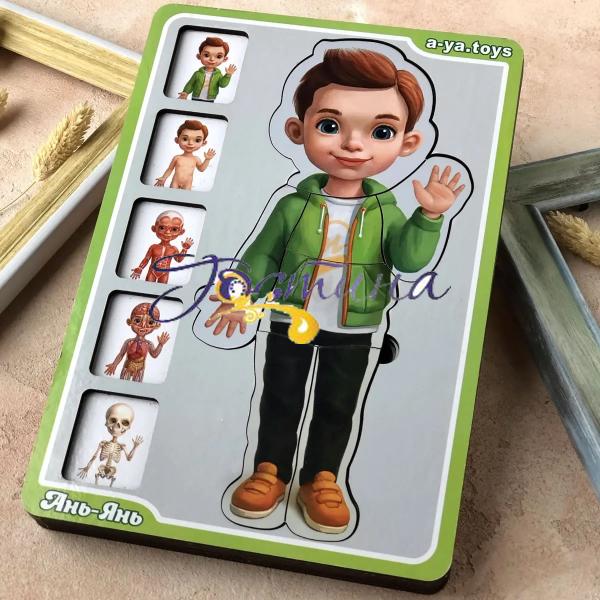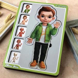 Тепер познайомити дитину з особливостями будови людського організму можна весело граючи. Наш 5-ти шаровий пазл - це цілий наочний посібник для докладного вивчення скелета, м'язової тканини, кровоносної системи, шкірного покриву і зовнішнього вигляду людини в одязі. У наборі 38 деталей.