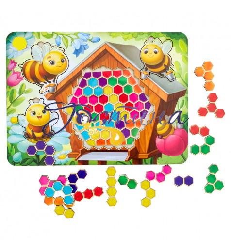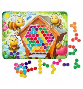 Це і вкладиші-бджілки, які зручно діставати пальчиком, і тетріс-соти. У наборі йде картинка-підказка для збирання тетрісу. Для маленьких діток можна просто вкладати бджіл та сортувати деталі за кольорами. Гра сприяє розвитку логічного мислення. За допомогою такого методичного матеріалу діти пізнають навколишній світ. Працює зорова пам'ять, тренується увага та посидючість