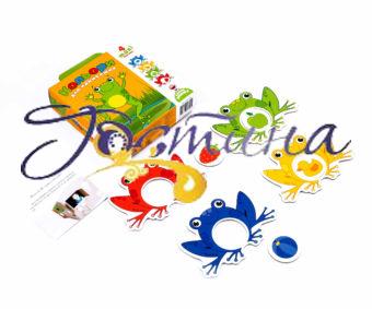 Розкладіть сортери-жабенят перед дитиною, а поряд деталі із зображенням предметів. Якого кольору полуниця? Шукаємо червону жабу та вкладаємо деталь у сортер. Жабка смачно поїла.