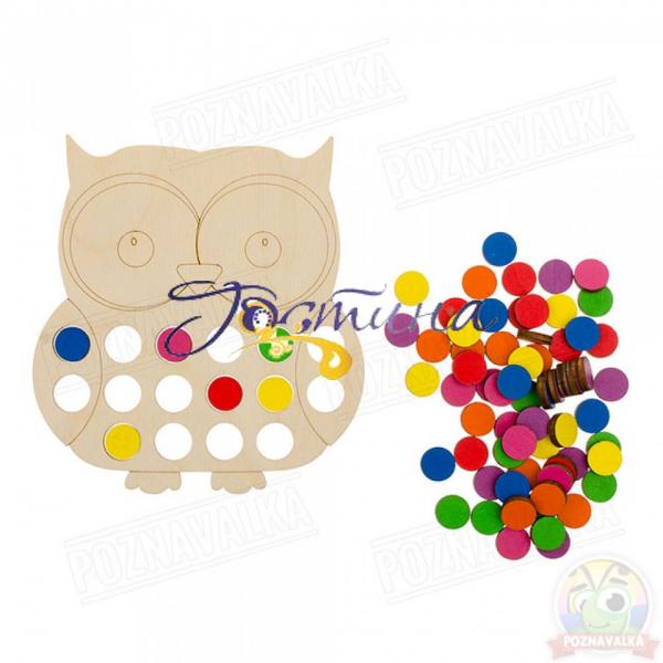 по картці-зразку підбирати необхідні кружечки, вважати їх і вставляти в сову