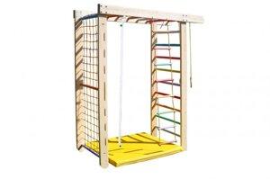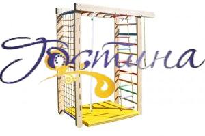 Матеріал спортивного комплексу з рукохідом: 1. Боковини шведської стінки - сосна. 2. Боковини гладіаторських сітки - сосна. 3.Перекладіни шведської стінки - деревина твердих порід ясен, клен, бук. У комплектацію входить: 1. Шведська стінка. 2. Гладіаторська сітка 3. Рукохід 4. Мотузковий набір 5. Кріплення. Допустимі динамічні навантаження: 1. На перекладини шведської стінки і турнік - 100кг. 2. На мотузковий набір - 60кг. Габаритні розміри : 1. Висота шведської стінки і гладіаторських сітки - 225см. 2. Ширина шведської стінки 80см 3. Ширина гладіаторських сітки 80см 4. Довжина рукохіду 160см. 5. Виступ турніка вперед 40см.