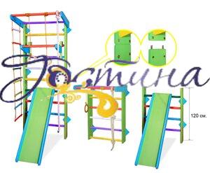 Матеріал спортивного куточка: 1. Боковини шведської стінки - сосна 2.Перекладіни шведської стінки - деревина твердих порід ясен, клен, бук. 3. Кільця - фанера. 4. Канат (діаметр 22мм) - натуральна бавовна. У комплектацію входить: 1. Шведська стінка з турніком. 2. Мотузковий набір. 3. Дитячий турнік. 4. Гірка. 5. Кріплення Допустимі динамічні навантаження: 1. На прекладіни шведської стінки і турнік - 100кг. 2. На мотузковий набір - 60кг 3. На турнічек - 40 кг. 4. На гірку - 40 кг. Габаритні розміри спортивного куточка: 1. Висота шведської стінки з турником - 240см. 2. Ширина шведської стінки з турником - 87см 3. Виступ верхнього турніка вперед - 50см.