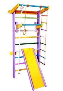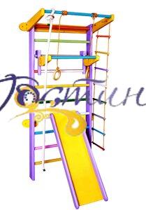 Матеріал спортивного куточка: 1. Боковини шведської стінки - сосна 2.Перекладіни шведської стінки - деревина твердих порід ясен, клен, бук. 3. Кільця - пластик. 4. Канат (діаметр 22мм) - натуральна бавовна. У комплектацію входить: 1. Шведська стінка з турніком. 2. Мотузковий набір. 3. Дитячий турнічек. 4. Дошка гірка 5. Кріплення Допустимі динамічні навантаження: 1. На прекладіни шведської стінки і турнік - 100кг. 2. На мотузковий набір - 60кг 3. На дитячий турнічек - 60кг. 4. На дитячу гірку - 50кг. Габаритні розміри спортивного куточка: 1. Висота шведської стінки з турником - 225см. 2. Ширина шведської стінки з турником - 87см 3. Виступ верхнього турніка вперед - 60см. 4. Ширина по відповідної планки 102 см