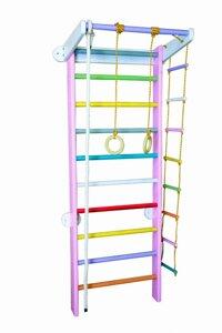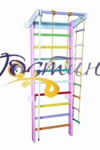 Матеріал спортивного куточка: 1. Боковини шведської стінки - сосна 2. Перекладини шведської стінки - деревина твердих порід ясен, клен, бук. 3. Кільця - пластик. 4. Канат (діаметр 22мм) - натуральна бавовна. У комплектацію входить: 1. Шведська стінка з турніком. 2. Мотузковий набір. 3. Кріплення Допустимі динамічні навантаження: 1. На прекладіни шведської стінки і турнік - 100кг. 2. На мотузковий набір - 60кг Габаритні розміри спортивного куточка: 1. Висота шведської стінки з турником - 225см. 2. Ширина шведської стінки з турником - 87см 3. Виступ верхнього турніка вперед - 60см. 4. Ширина по відповідної планки 102 см