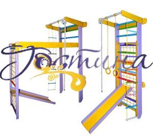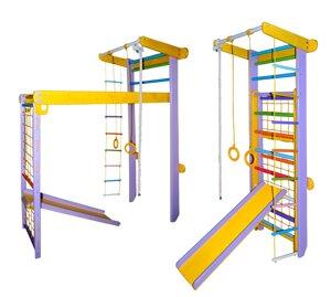 Спортивний куточок Трансформер з гіркоюМатеріал спортивного куточка Трансформер: 1. Боковини шведської стінки - сосна 2.Перекладіни шведської стінки - деревина твердих порід ясен, клен, бук. 3. Кільця - фанера. 4. Канат (діаметр 22мм) - натуральна бавовна. У комплектацію входить: 1. Шведська стінка з турніком. 2. Піратська сітка з 2-ух частин (висота сітки 170см) 3. Рукохід (довжина рукохіду 160см) 4. Мотузковий набір. 5. Дитяча гірка. 6. Кріплення Гойдалка-диск у вартість не входить. Допустимі динамічні навантаження: 1. На прекладіни шведської стінки і турнік - 100кг. 2. На мотузковий набір - 60кг 3. На дитячу гірку - 40кг. 4. На рукоход - 50кг. Габаритні розміри спортивного куточка: 1. Висота шведської стінки з турником - 225см. 2. Ширина по відповідної планки 102 см.