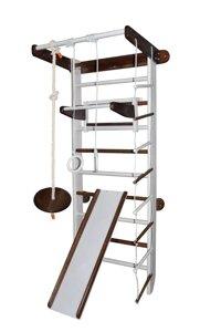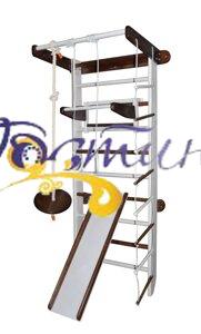 Матеріал спортивного куточка: 1. Боковини шведської стінки - сосна 2.Перекладіни шведської стінки - деревина твердих порід ясен, клен, бук. 3. Кільця - пластик. 4. Канат (діаметр 22мм) - натуральна бавовна. У комплектацію входить: 1. Шведська стінка з турніком. 2. Мотузковий набір. 3. Дитячий турнічек. 4. Дошка гірка 5. Диск-гойдалка. 6. Кріплення Допустимі динамічні навантаження: 1. На прекладіни шведської стінки і турнік - 100кг. 2. На мотузковий набір - 60кг 3. На дитячий турнічек - 60кг. 4. На дитячу гірку - 50кг. Габаритні розміри спортивного куточка: 1. Висота шведської стінки з турником - 225см. 2. Ширина шведської стінки з турником - 87см 3. Виступ верхнього турніка вперед - 60см. 4. Ширина по відповідної планки 102см