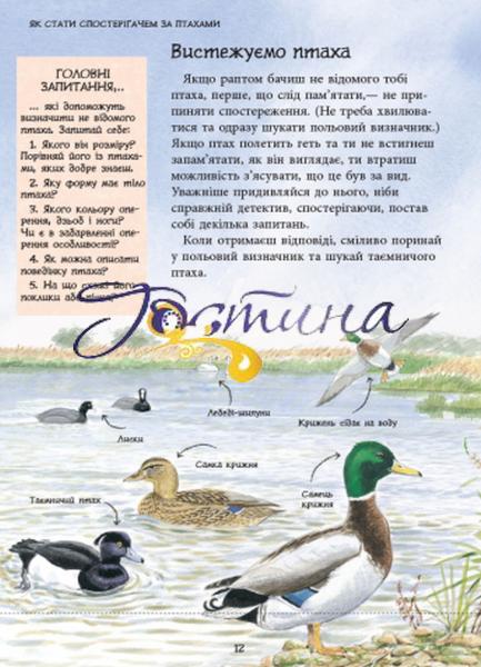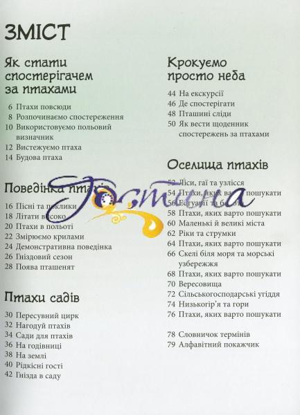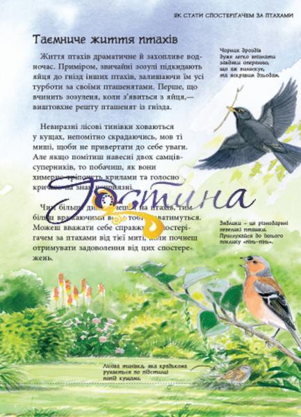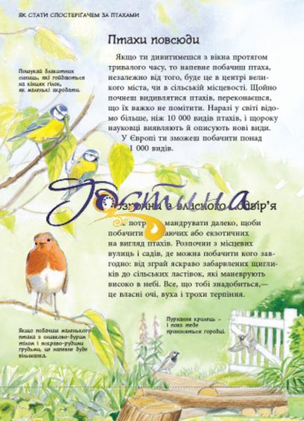 Книга познайомить читача зі світом птахів. Дитина дізнається про вражаючі факти із життя птахів та відкриє для себе одне з найкращих місць для спостережень — власне вікно. Розкриє таємниці птахів, які мешкають у садах, та, послуговуючись порадами, крок за кроком, стане справжнім дослідником їхнього життя.