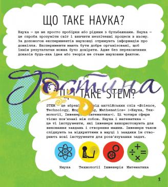 STEM — це напрям в освіті, який навчає дітей природничим наукам, технологіям, математиці та інженерії. Виконуючи завдання з цієї книжки, дитина засвоїть необхідні базові знання з природничих наук і застосує їх на практиці. Вона дізнається, як утворюється блискавка, що таке ланцюгова реакція та як ми чуємо звуки.