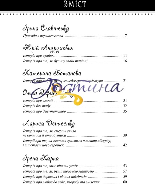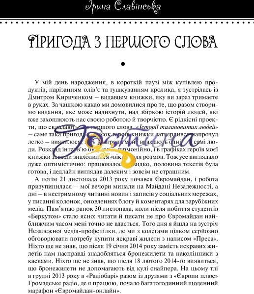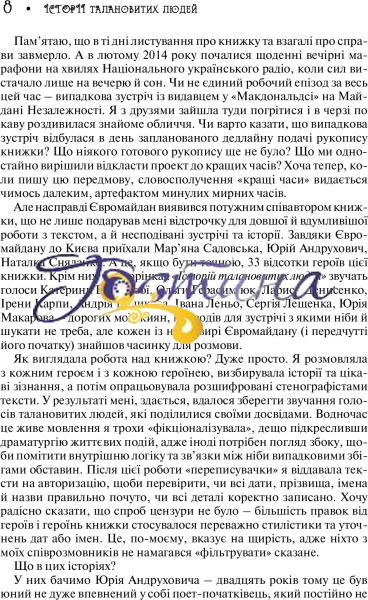 «Історії талановитих людей» – продовження популярної серії «Теплі історії», майже всі книжки якої стали українськими бестселерами.Що в цій книжці? Життєві історії людей, яких ми всі знаємо і любимо:Юрiй Андрухович Катерина БотановаОльга Герасим’юк Лариса Денисенко Iрена Карпа Андрiй Куликов Iван Леньо Сергiй Лещенко Юрiй Макаров Мар’яна Садовська Наталка Сняданко Авторка розмовляла з кожним героєм і з кожною героїнею, визбирувала історії та цікаві зізнання. У результаті їй вдалося зберегти звучання голосів талановитих людей, які поділилися своїми досвідами. Водночас це живе мовлення вона трохи «фікціоналізувала», дещо підкресливши драматургію життєвих подій, адже іноді потрібен погляд збоку, щоби помітити внутрішню логіку та зв’язки між ніби випадковими збігами обставин.