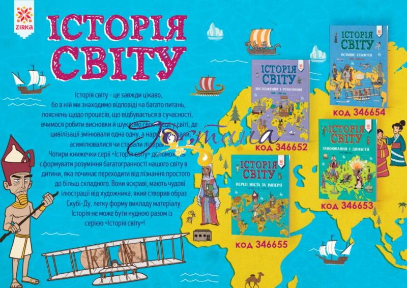 Історія світу — це завжди цікаво, бо в ній ми знаходимо відповіді на багато питань, пояснень, вчимося робити висновки й шукаємо своє місце у світі, де цивілізації змінювали одна одну, а народи зникали, асимілювалися чи ставали лідерами! Чотири книжечки серії «Історія світу» допоможуть сформувати розуміння багатогранності нашого світу в дитини, яка починає переходити від пізнання простого до більш складного. Вони яскраві, мають чудові ілюстрації від художника, який створив образ Скубі-Ду, легку форму викладу матеріалу. Історія не може бути нудною разом із серією «Історія світу»!