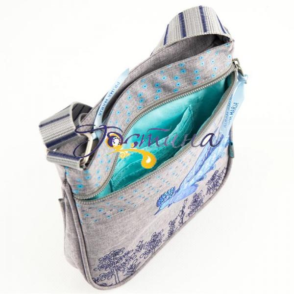 Сумка Kite (Кайт) Prima Maria - зручна і мульфункціональная модель сумки через плече виконана з поліестеру сірого кольору з ліцензійним зображенням казкового птаха відомої художниці Марії Примаченко.