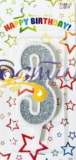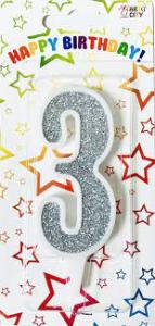 Свічка - цифра на торт «3» біла з сріблом