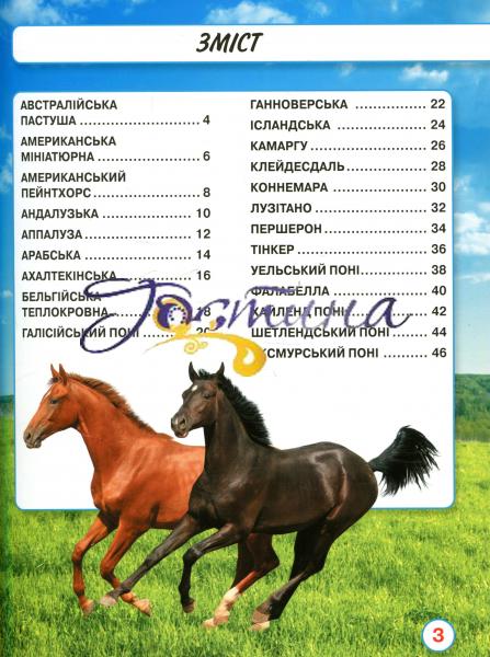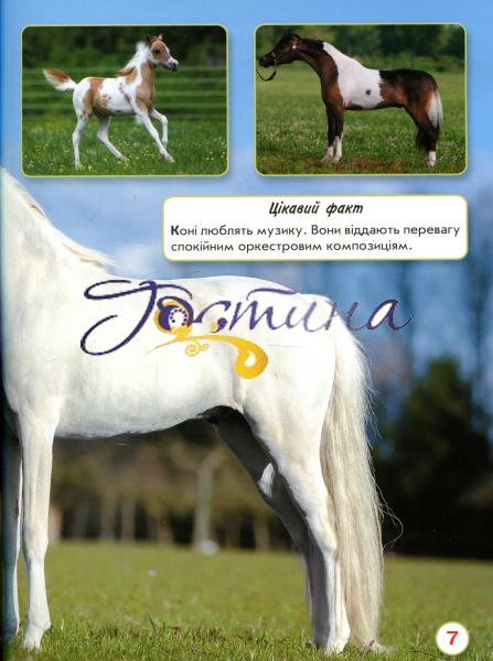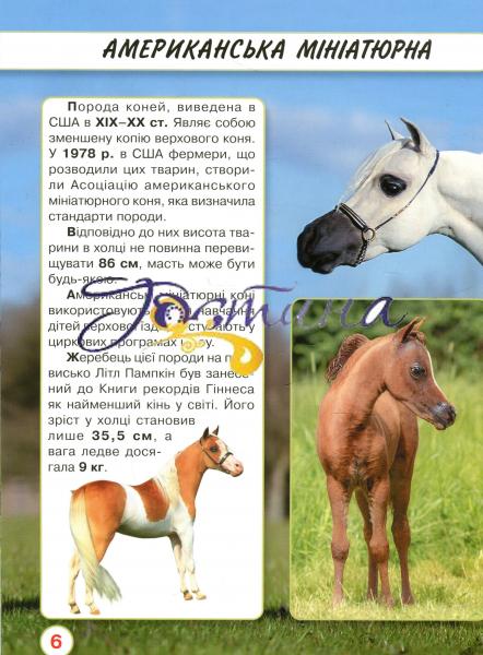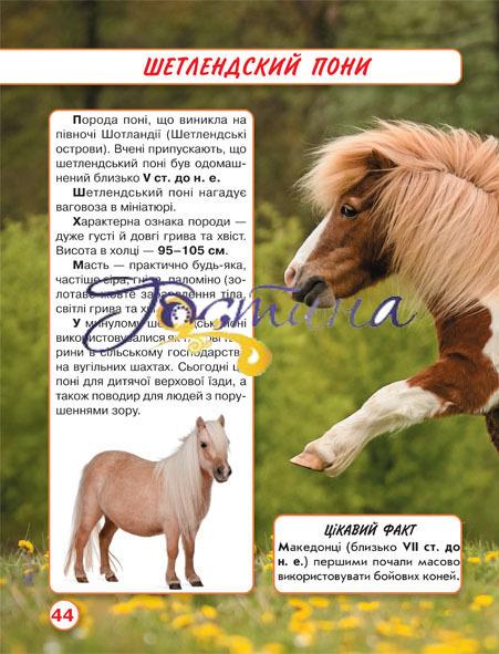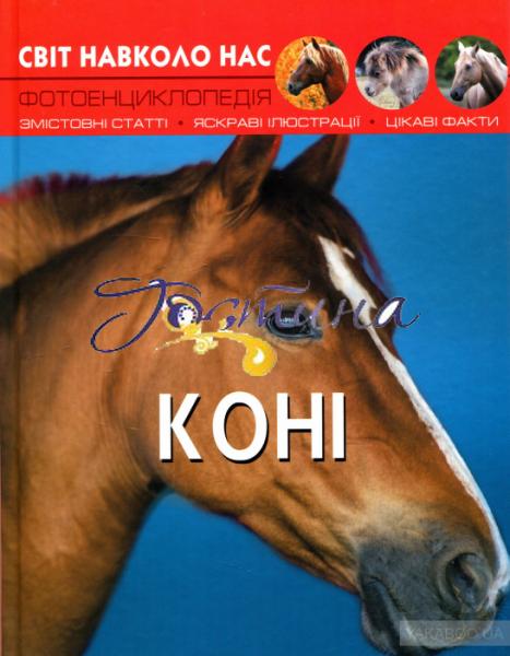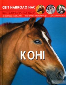 Наші знання про коней обмежуються переважно інформацією, одержаною з кінофільмів. Видання, яке ви тримаєте в руках, покликане розширити уявлення читачів про цих дивовижних тварин, їхню вдачу й особливості поведінки. На сторінках енциклопедії ви знайдете опис найзнаніших порід і маловідомі факти з життя їхніх представників. А яскраві фотоілюстрації, розміщені в книжці, розкриють природну грацію та красу, притаманну цим тваринам. Книжку адресовано допитливим дівчаткам і хлопчикам, а також їхнім турботливим батькам.
