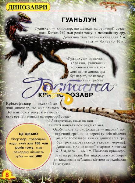 Не одне десятиліття динозаври й усе, що з ними пов'язане, є об'єктом пильної уваги як з боку палеонтологів, так і серед людей, чия професійна діяльність не стосується вивчення цих викопних ящерів. На сторінках нашої книжки ми розповімо про те, який спосіб життя був притаманний цим рептиліям. Ви зможете подивитися на них очима художників-анімалістів, які реконструюють викопних тварин за їхніми рештками. Сподіваємося, що це яскраво ілюстроване видання посяде гідне місце у вашій бібліотеці поряд з енциклопедіями й науково-популярними книжками. Книжку адресовано широкому читацькому загалу.