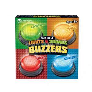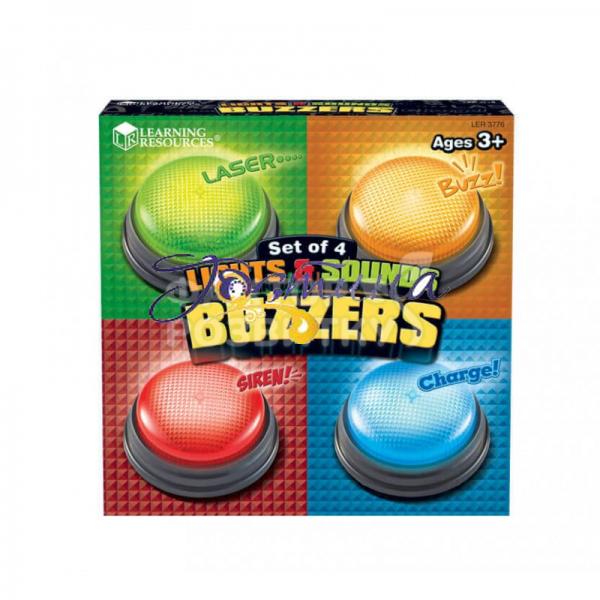 Кнопки для голосування зі світловим сигналом 4 різних звуки зі світловою індикацією Пожвавлюйте шкільні заняття з цими миготливими кнопками для розвитку ініціативності Оживіть будь-яку змагальну гру з набором: - Звукові кнопки з відмінними звуками - Ідеально підходить для тестів і вікторини - Взаємодія залучає учнів бути ініціативними - Світло з’являється на певний час після натиснення - Чотири кольори: синій, червоний, зелений та жовтий - Чотири звуки: сирена, заряд, лазер та зумер