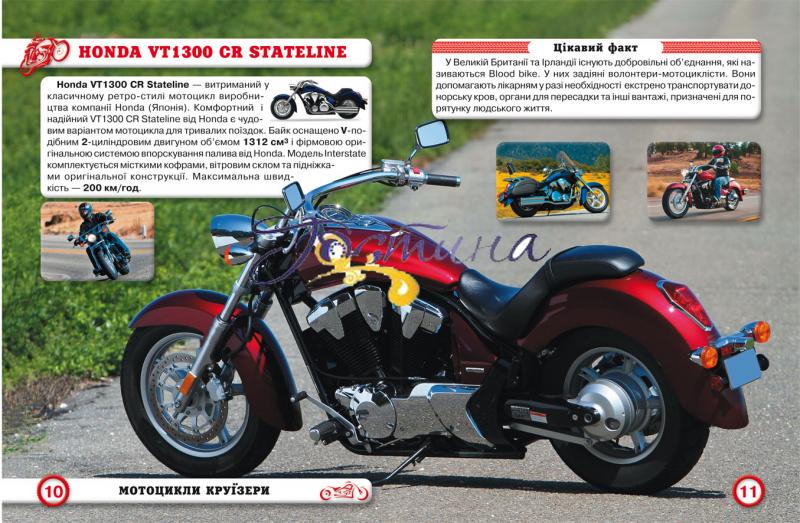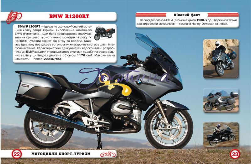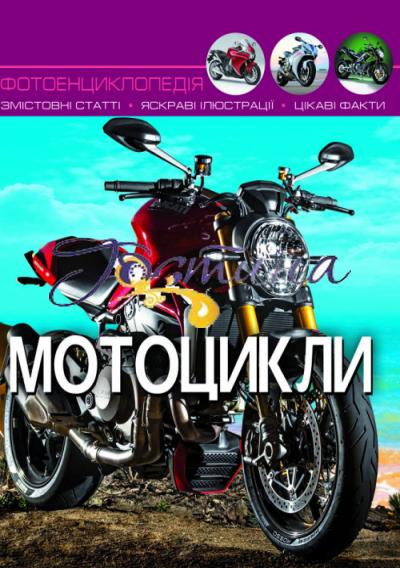 Попередники сучасних мотоциклів — повільні й неповороткі двоколісні саморушні машини, які з'явилися в 60-х рр. XIX ст., — з часом трансформувалися у швидкі та маневрені байки. Сьогодні існує багато різновидів «залізних коней», основні з яких представлено в цій книжці. Крім технічних характеристик мотоциклів, ви знайдете тут інформацію стосовно їхніх чотириколісних побратимів — квадроциклів. Розміщені на сторінках видання яскраві фотографії продемонструють особливості дизайну кожної моделі й покажуть мотоцикли в динаміці. Книжку адресовано допитливим хлопчикам і дівчаткам, а також їхнім батькам.