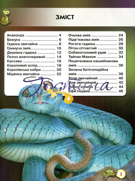 Змії можуть викликати відразу, жахати або, навпаки, зачаровувати, однак навряд чи є люди, яких ці плазуни залишають байдужими. Цим рептиліям притаманна особлива магнетична краса, що змушує мимоволі захоплюватися ними. Ви зможете самі в цьому переконатися, розгорнувши нашу книжку, у якій зібрано ілюстрації найяскравіших представників виду. Коротка інформація, що доповнює фото, допоможе дізнатися більше про спосіб життя змій. Книжку адресовано допитливим юним читачам.